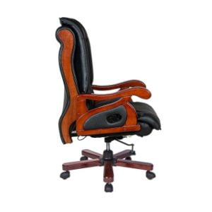 Ghế giám đốc cao cấp may trang trí hình thang, hai bên có múi ôm lưng. Đệm ngồi có thêm miếng da trang trí tạo điểm nhấn cho sản phẩm. Cơ cấu ngả lưng bên tay phải của ghế.